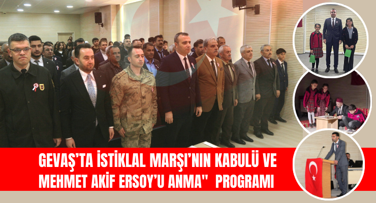 Gevaş’ta, İstiklal Marşı’nın kabulünün 104. yılı ve Mehmet Akif Ersoy’u anma günü dolayısıyla anlamlı bir program düzenlendi. 75. Yıl Ortaokulu ve Atatürk İmam Hatip Ortaokulu tarafından organize edilen etkinlik, Anadolu İmam Hatip Lisesi Konferans Salonu’nda gerçekleştirildi. Programa Gevaş Kaymakamı Bayram Yıldız, ilçe protokolü üyeleri, bazı sivil toplum kuruluşu (STK) temsilcileri, muhtarlar, öğretmenler, öğrenciler ve vatandaşlar katıldı.
